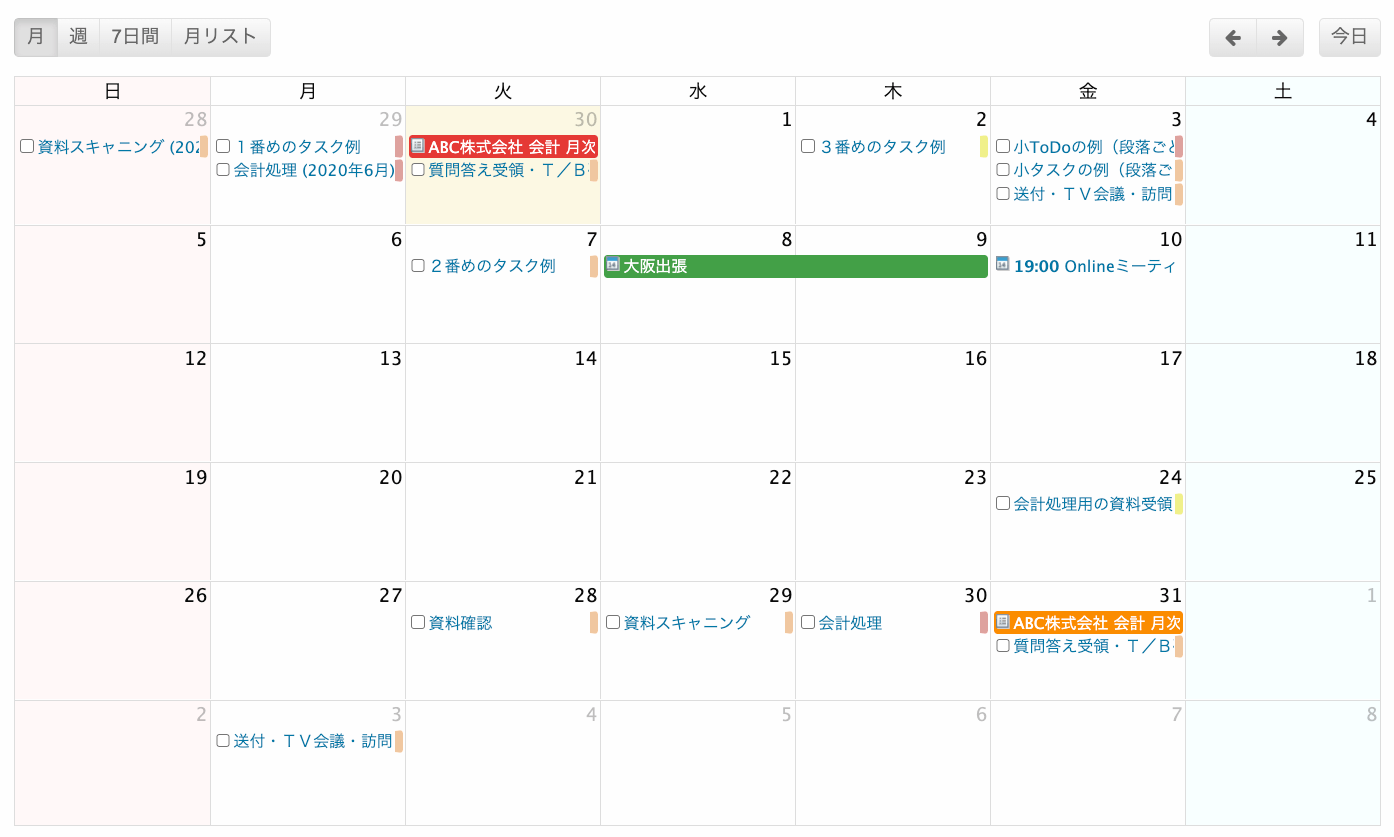 カレンダー画面には、タスク(ToDo)、スケジュール、案件などが表示され、進行中の仕事や今後の仕事を確認できます。